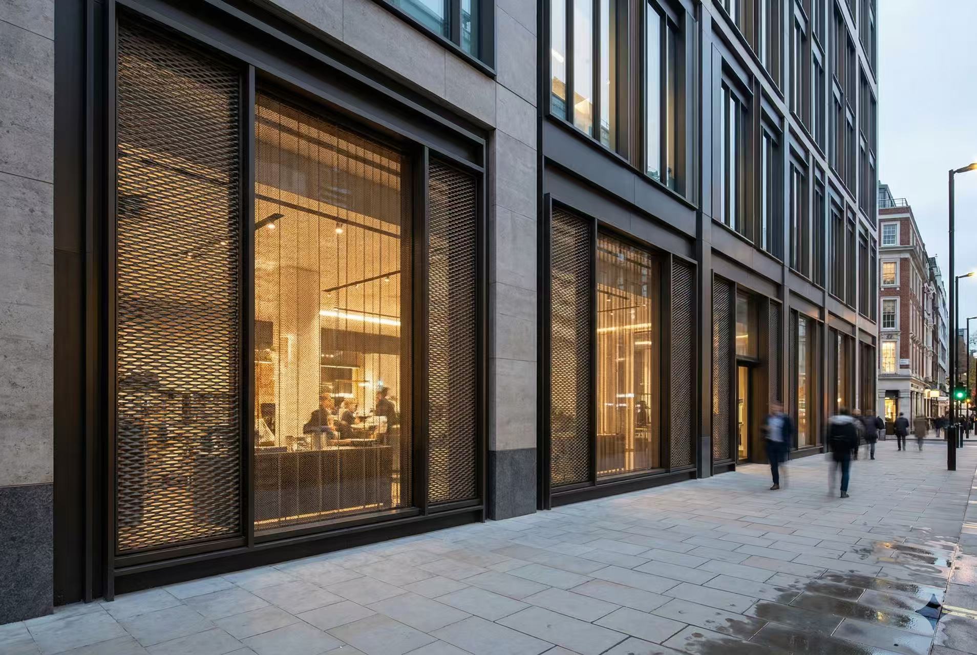 Commerciële gevel met aluminium veiligheidsgaas – bescherming van de begane grond